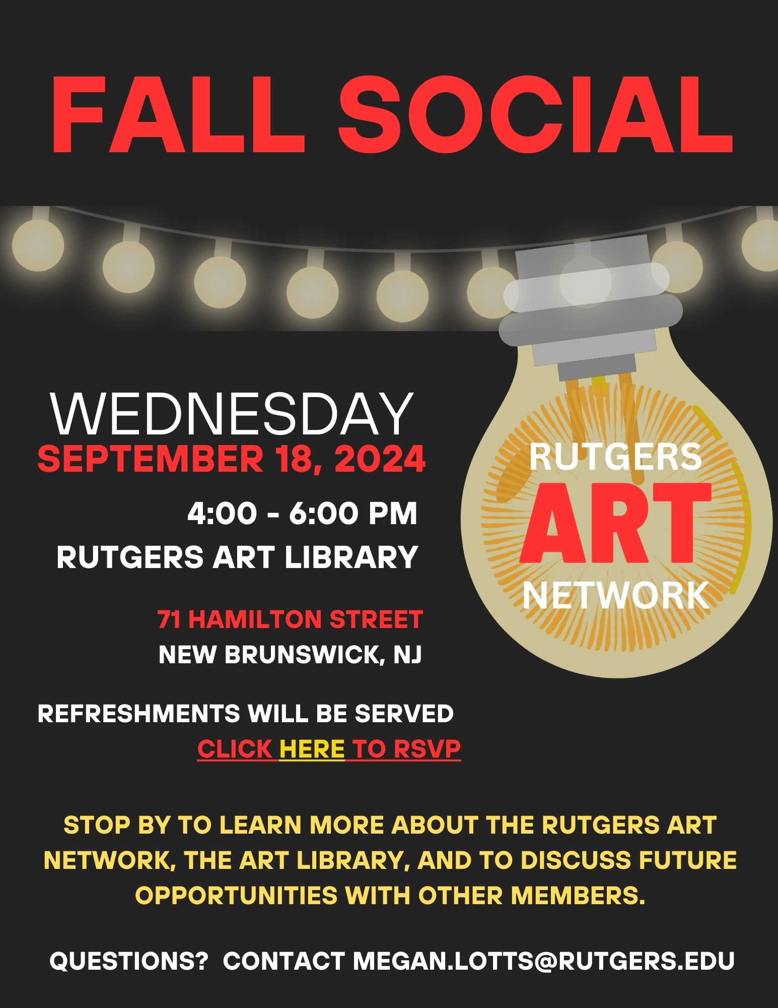 Rutgers Art Network has opened up this year to include graduate students. Stop by to learn more about the Rutgers Art Network, the Art Library, and to discuss future opportunities with other members. Graduate students are welcome.
