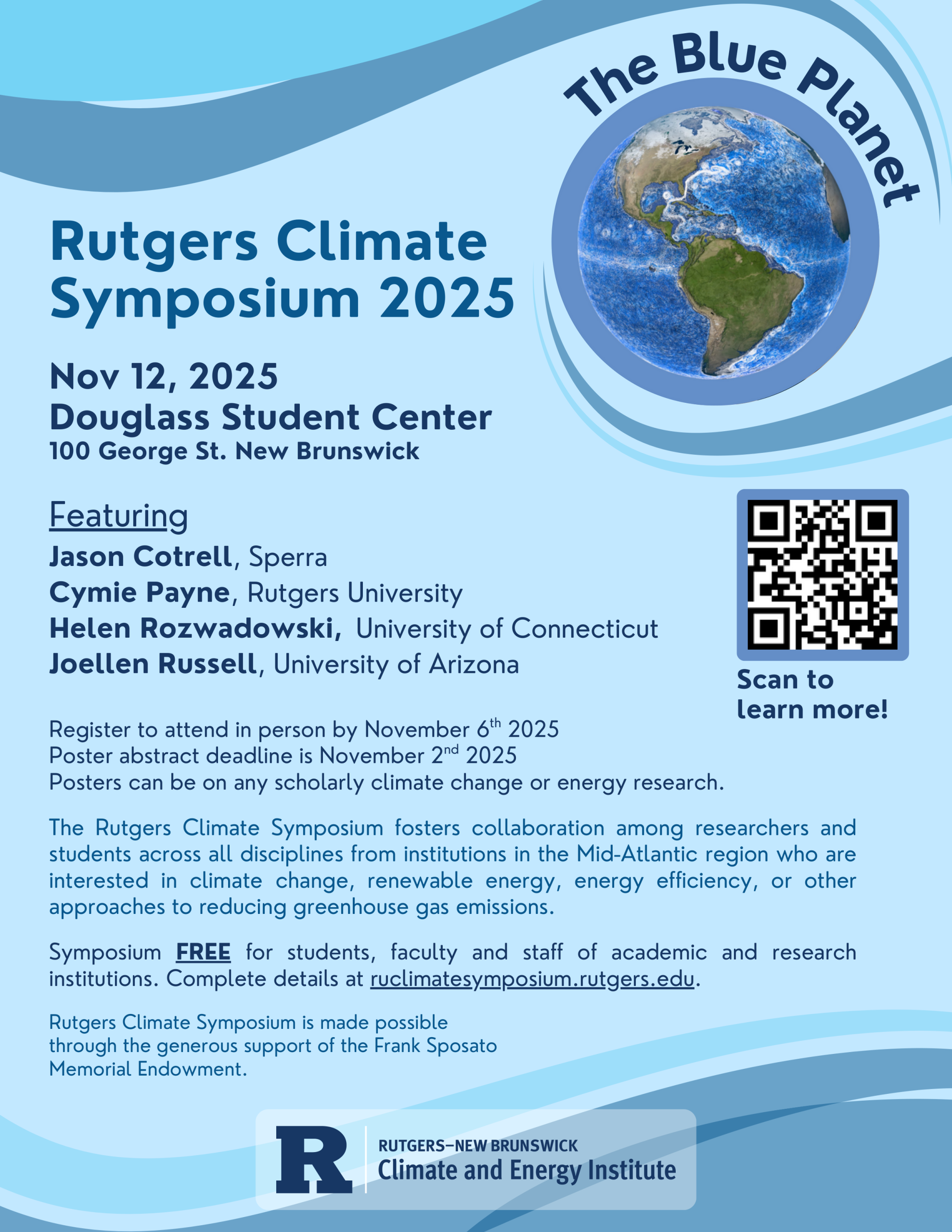 Please join the Rutgers Climate and Energy Institute for the Rutgers Climate Symposium 2025: The Blue Planet! This symposium will feature speakers: Jason Cotrell, Sperra; Cymie Payne, Rutgers University; Helen Rozwadowski, University of Connecticut; Joellen Russell, University of Arizona. This event will take place on November 12, 2025 at the Douglass Student Center, Rutgers University in person and virtually. Register for in person here and virtual here.