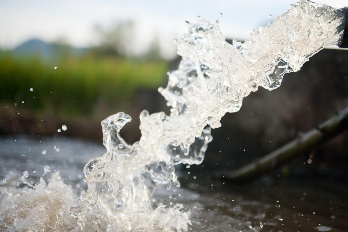 Close up on stream of water flowing from irrigation pipe near agricultural field